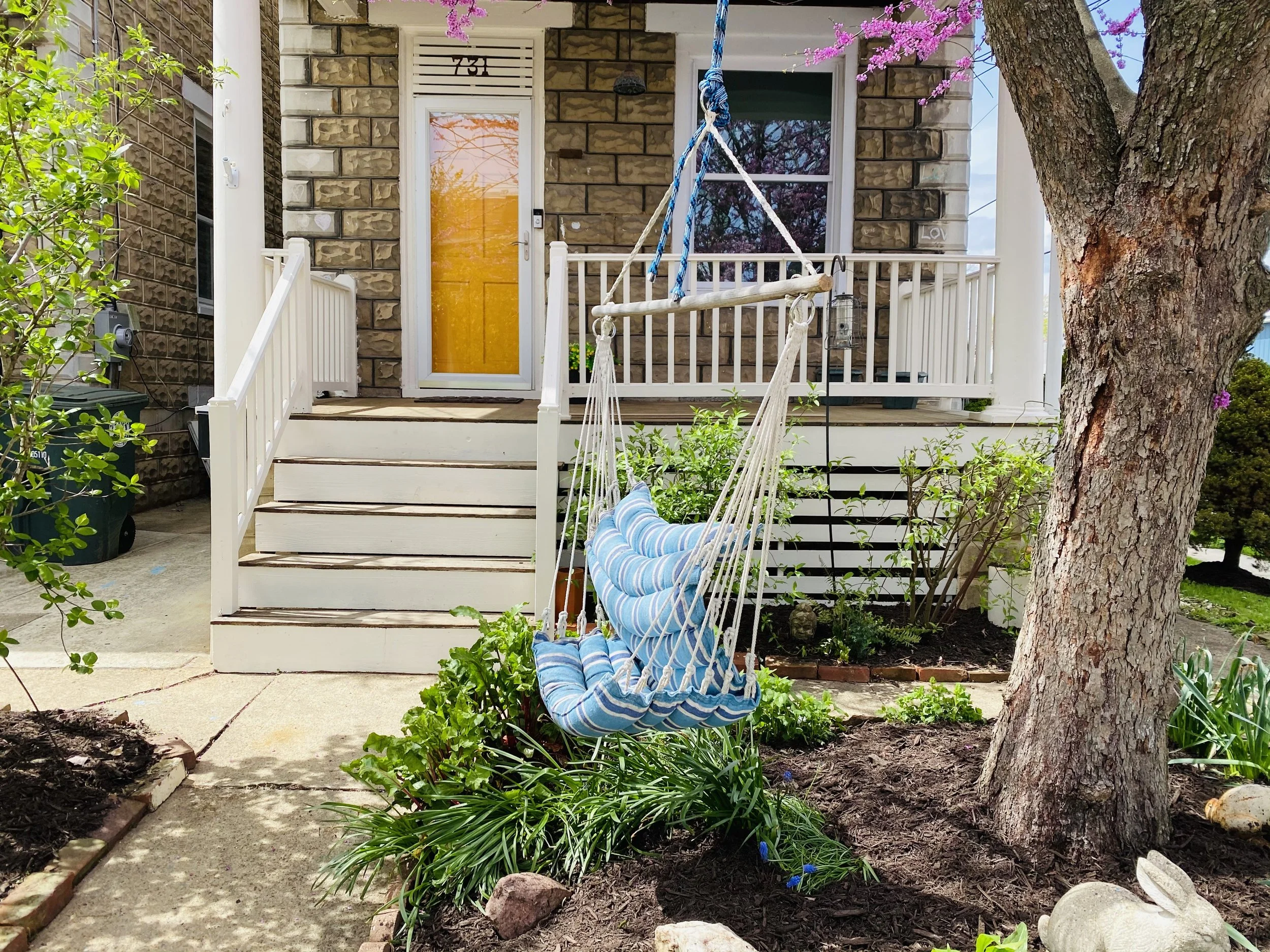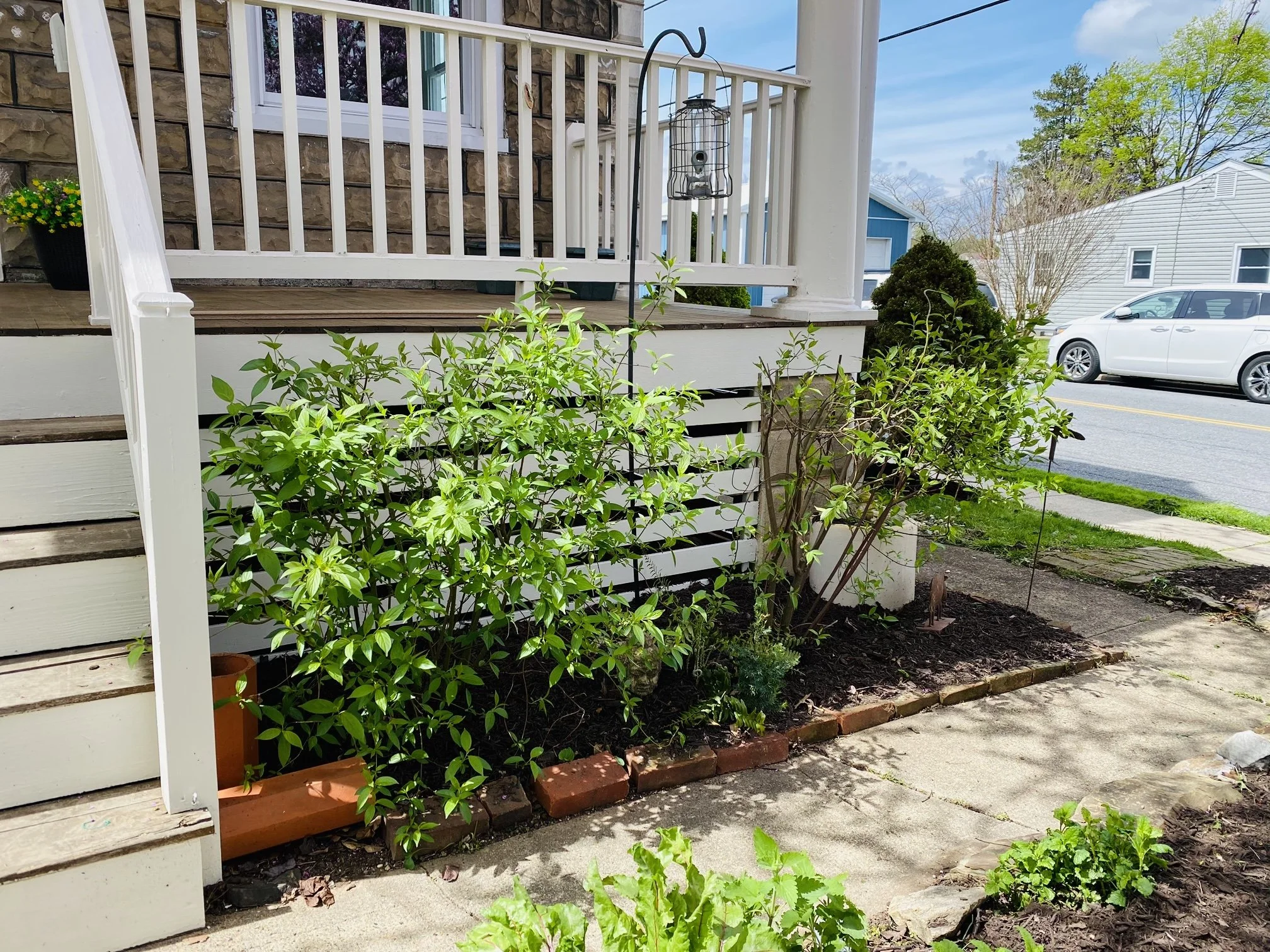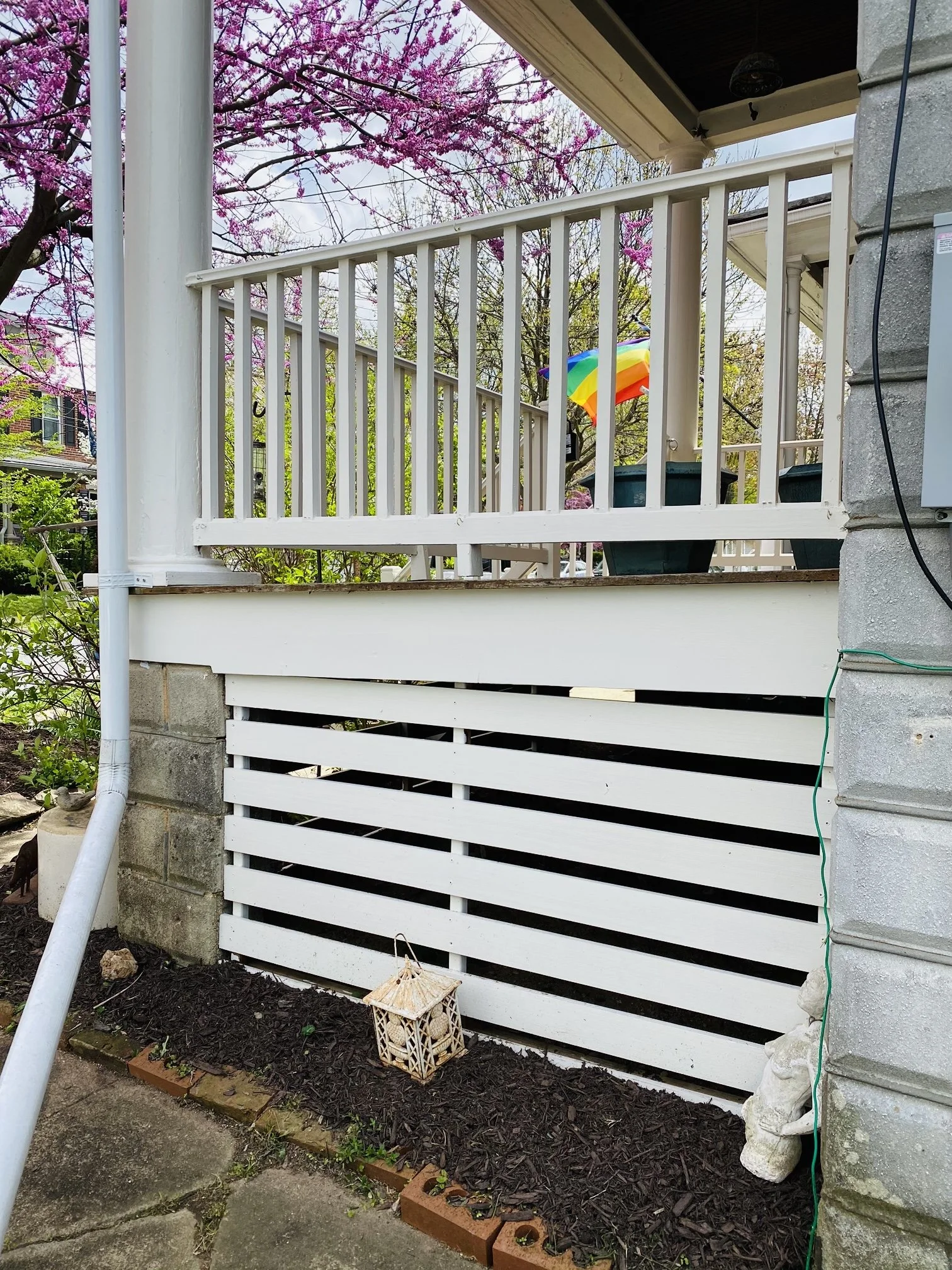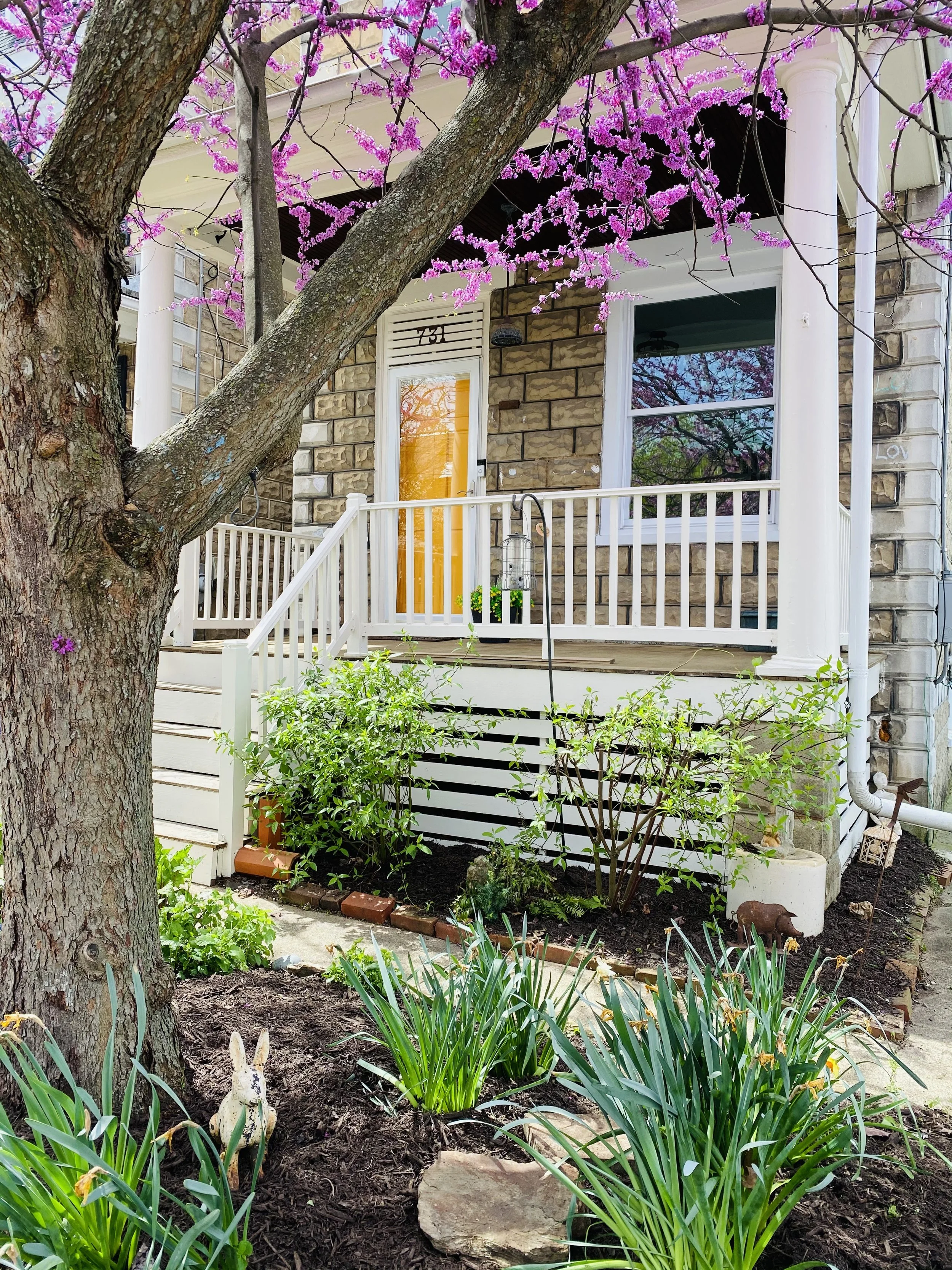 Before putting this house on the market, the sellers needed to spiff up their curb appeal. The front door was repainted with a welcoming bright yellow. The porch floor and railings were stripped down to the original wood and stained and painted. A new ceiling, new stairs, and new slatted skirting were installed and painted.
